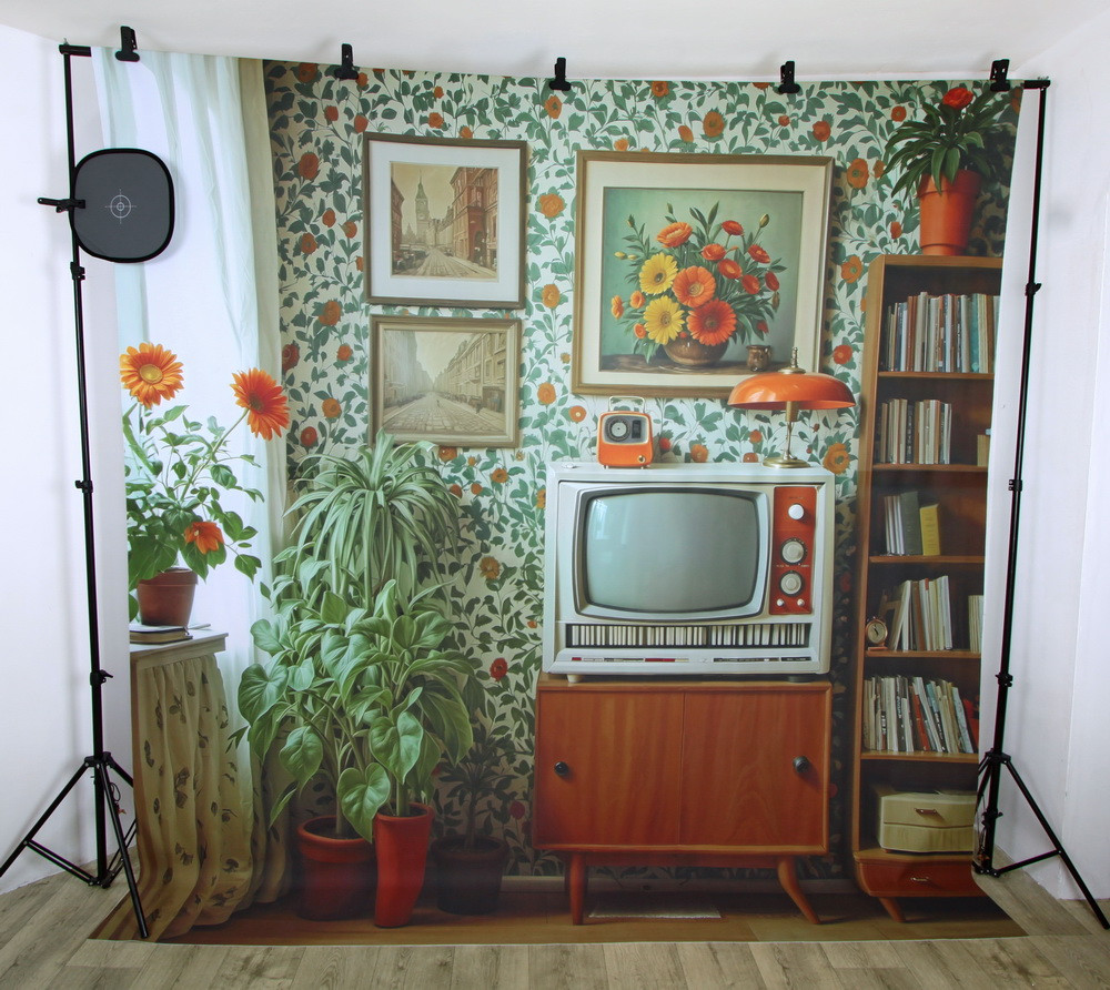 Уютная комната, родом из прошлого с ламповым телевизором на деревянной тумбе и множеством аппаратуры..