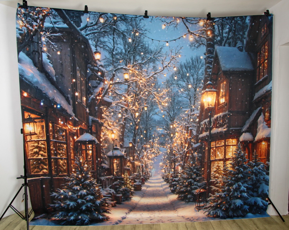 На изображении запечатлен зимний пейзаж, представляющий собой улицу в заснеженном поселке. По обе ст..