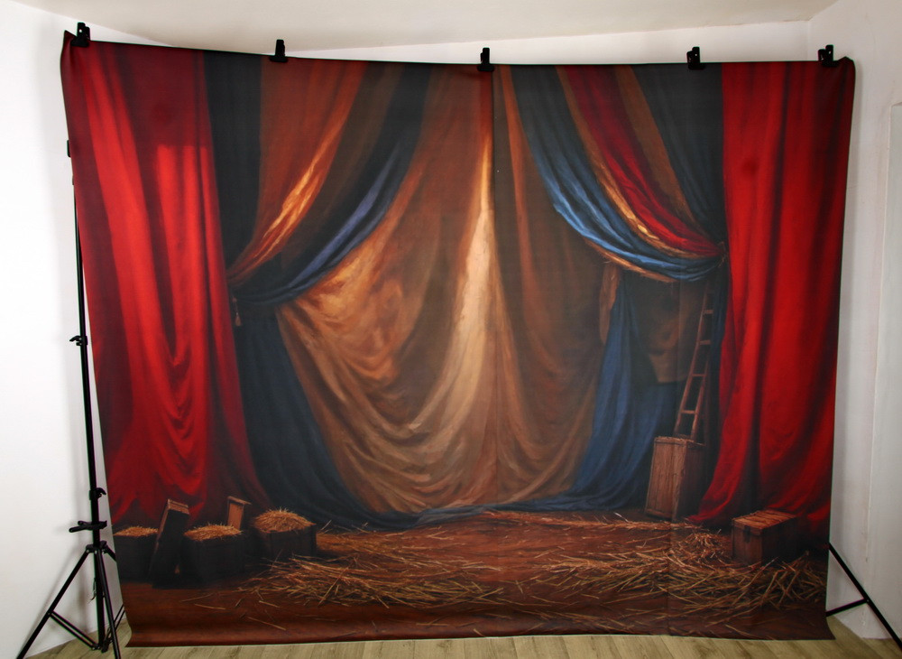 Изображение представляет собой сцену с декорациями, напоминающими цирковой шатер или театральную сце..