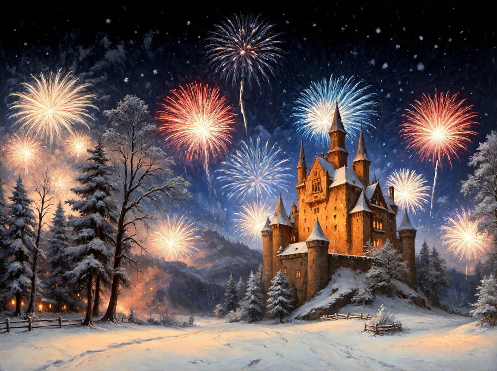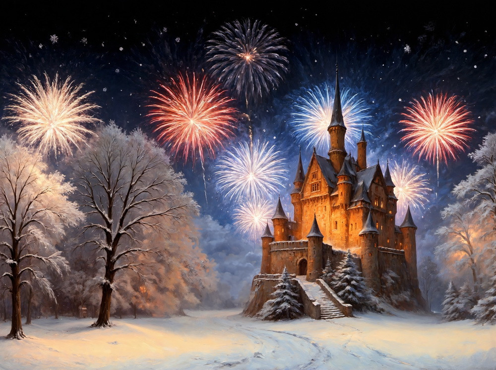 На изображении представлен зимний пейзаж с замком на фоне ночного неба, украшенного фейерверками. Зе..