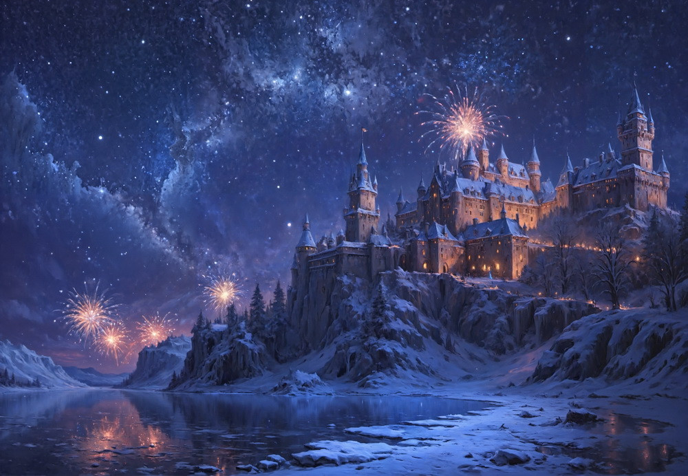 На изображении представлен зимний пейзаж с ледяным замком в центре. Замок выполнен в готическом стил..