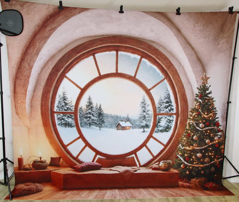 Изображена комната с круглым окном, через которое виден зимний пейзаж. На снегу стоит небольшой дере..
