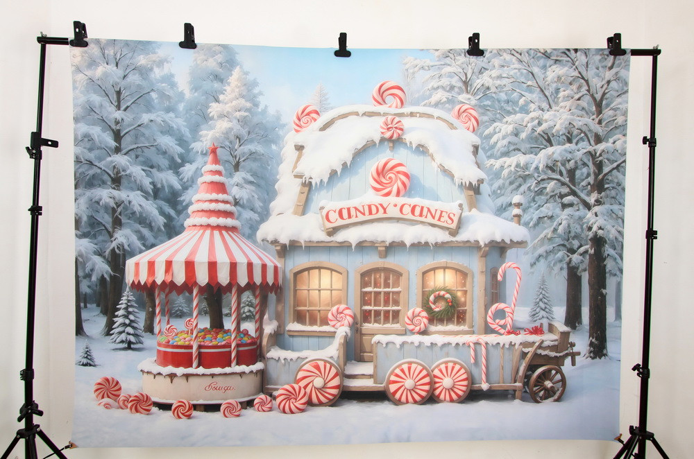 На изображении представлен сказочный зимний пейзаж с кондитерской лавкой, окруженной заснеженным лес..