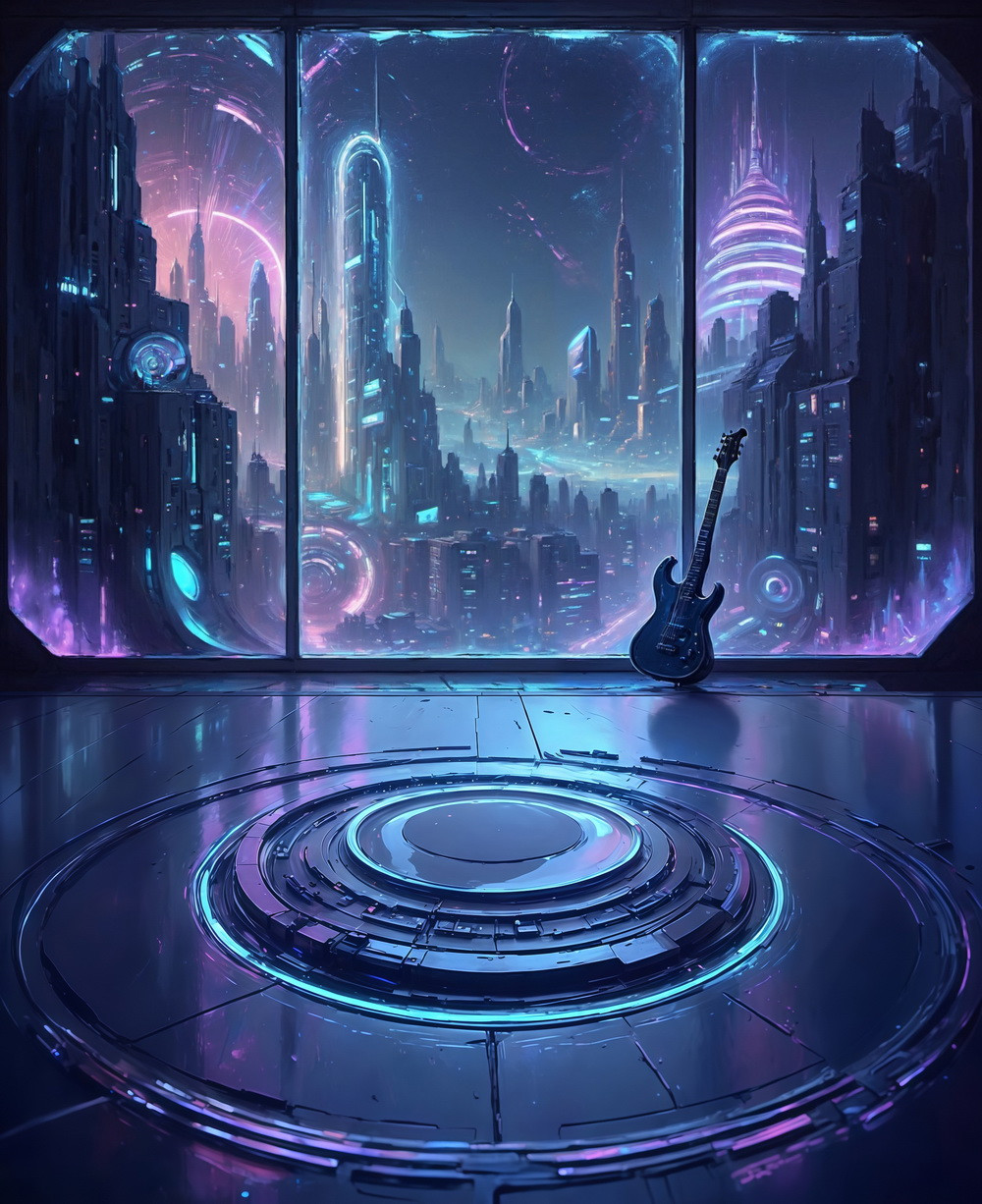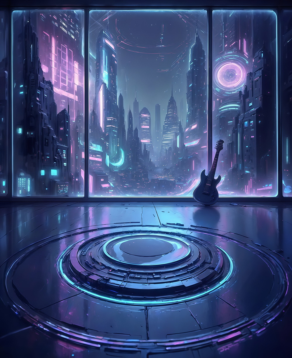 Перед окном стоит синяя электрогитара, прислоненная к стене. Окно состоит из трех секций, через которые виден городской пейзаж. Город полон высоких небоскребов с футуристическим дизайном, подсвеченных неоновыми огнями различных цветов, включая синий, фиолетовый и розовый. В небе видны светящиеся элементы, создающие атмосферу технологичного будущего.