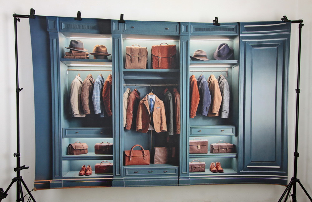 На изображении представлен встроенный шкаф тёмно-синего цвета с тремя секциями. В верхней части левой секции расположены две шляпы, лежащие на стопке ткани или одежды, и еще одна шляпа рядом с ними. Ниже висит несколько курток разных цветов и текстур. На следующей полке расположены две коричневые кожаные сумки. Внизу на полке стоят коричневые кожаные туфли и небольшая сумка.