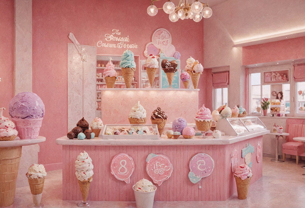 Изображение демонстрирует интерьер розового кафе-мороженого. Большинство поверхностей и элементов дизайна выполнены в различных оттенках розового, создавая мягкую, пастельную атмосферу.В центре кадра расположен прилавок, на котором выставлены разнообразные виды мороженого и других сладостей. Сверху прилавок украшен рожками с разноцветным мороженым. На переднем плане прилавка видны декоративные элементы, такие как цифры и логотипы кафе в розовых тонах. Под потолком висит люстра с круглыми плафонами, излучающая мягкий свет.В правой части изображения расположена зона с столиками и стульями, также оформленная в розовых оттенках. За прилавком виднеется окно, сквозь которое просматривается улица. На заднем плане, над прилавком, располагается надпись "The Precious Colour Boodle".