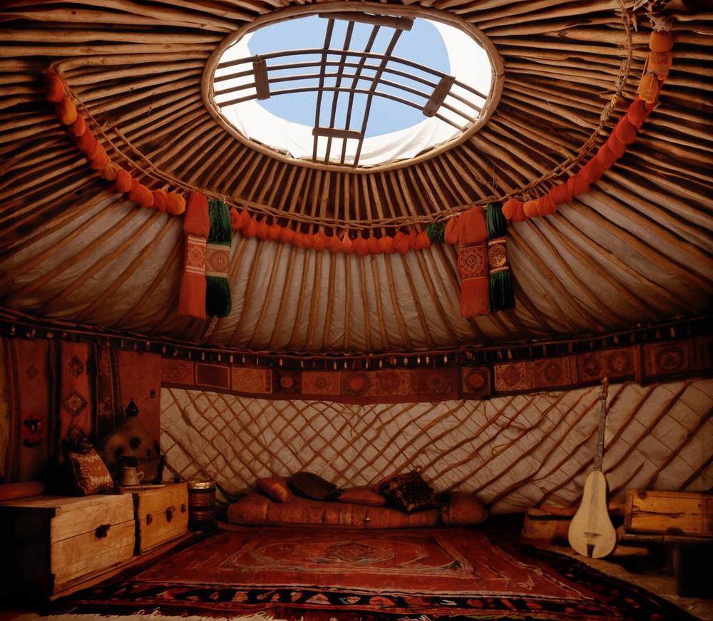 Изображение показывает интерьер юрты. Стены и крыша состоят из деревянных реек, покрытых тканью. В центре крыши есть круглое отверстие, через которое виден голубой кусочек неба. Вокруг этого отверстия висит гирлянда из оранжевых помпонов, между которыми висят украшения из ткани с вышивкой.