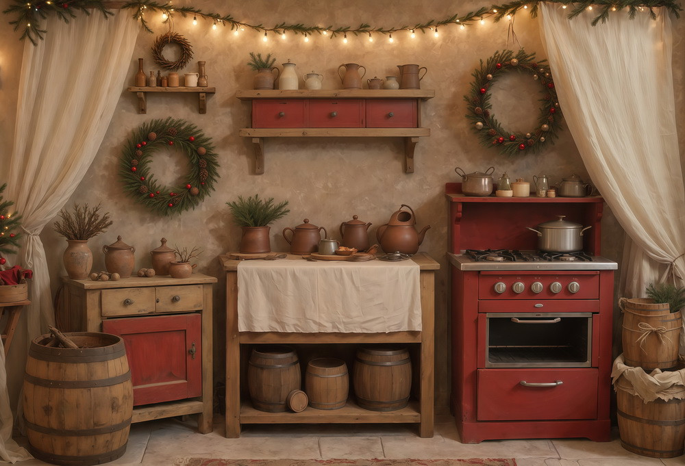 На изображении представлена уютная кухня, оформленная в деревенском стиле с элементами рождественского декора.Стены имеют текстурированную отделку бежевого цвета. Под потолком висит гирлянда из еловых веток с теплыми огоньками. На стене размещены деревянные полки, на которых расставлены различные керамические кувшины, банки и другие предметы декора. Также на стенах висят два рождественских венка, украшенные шишками и красными ягодами. Окна оформлены светлыми, полупрозрачными шторами.В центре композиции находится деревянный стол, накрытый белой скатертью. Под столом стоят небольшие деревянные бочки. Рядом со столом находится комод с двумя выдвижными ящиками и дверцей красного цвета. На комоде расставлены керамические горшки и вазы. Справа от стола стоит красная газовая плита с духовкой. На плите стоит кастрюля из нержавеющей стали. Рядом с плитой также можно увидеть деревянные бочки, наполненные ветками ели.На переднем плане стоит большая деревянная бочка, наполовину заполненная дровами. На полу виден ковер с геометрическим орнаментом. Общая атмосфера изображения создает ощущение тепла, уюта и подготовки к рождественским праздникам.
