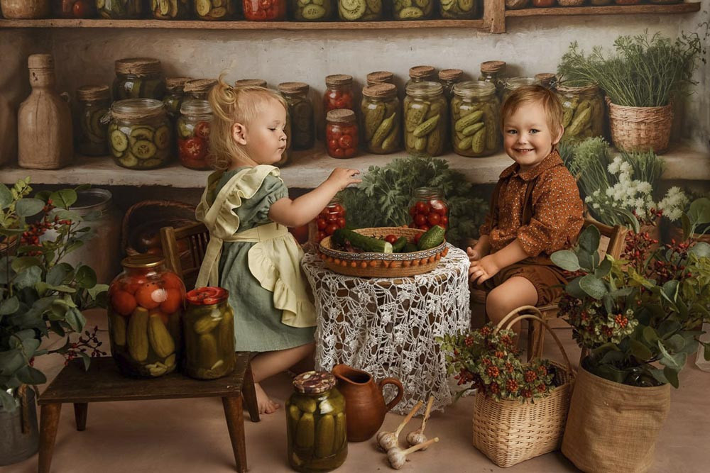 На нижней полке, помимо банок с консервированными огурцами и помидорами, стоит керамическая бутылка, а также корзины с укропом, петрушкой, зеленым луком и цветущим чесноком.