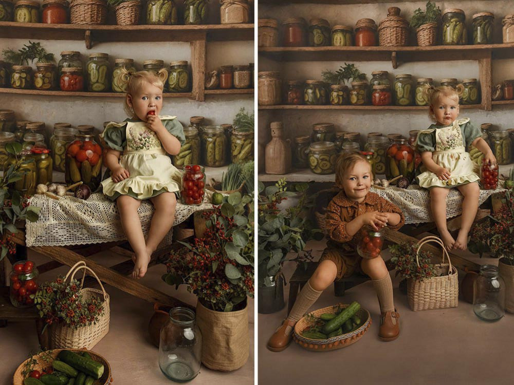 На полу перед полками стоят корзины с помидорами, цукини и луком-пореем, а также большая металлическая банка и маленькая корзина с неизвестным содержимым.