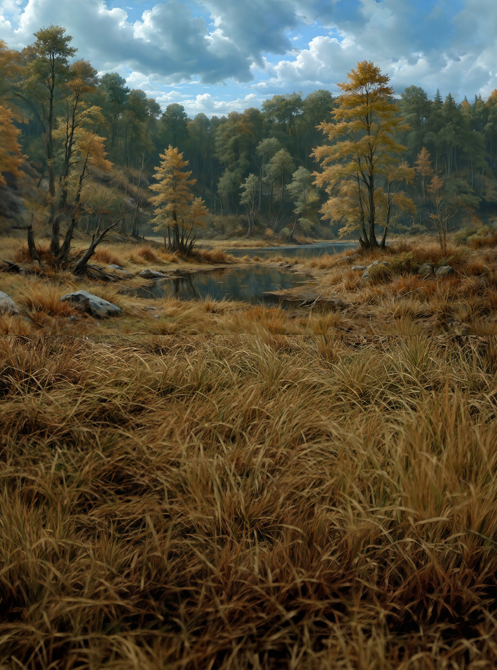 На переднем плане расположено поле высокой сухой травы, преобладают оттенки коричневого и золотистого. Трава выглядит густой и переплетенной, создавая текстурный узор.Далее, в центре изображения, находится небольшой пруд или тихая заводь с темной водой, в которой отражается небо. Берега водоема покрыты такой же сухой травой и камнями.На заднем плане простирается лес, деревья которого имеют различные оттенки зеленого и желтого, указывая на осенний период. Небо над лесом голубое с белыми облаками.Все изображение выполнено в приглушенных, природных тонах, создавая спокойную и умиротворяющую атмосферу.