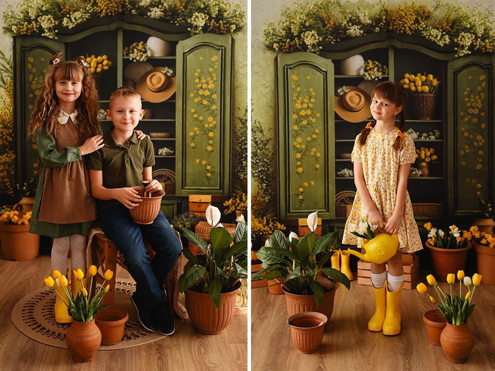 Стены на заднем плане имеют текстурированную светло-зеленую окраску. Композиция создает впечатление весеннего, деревенского стиля.