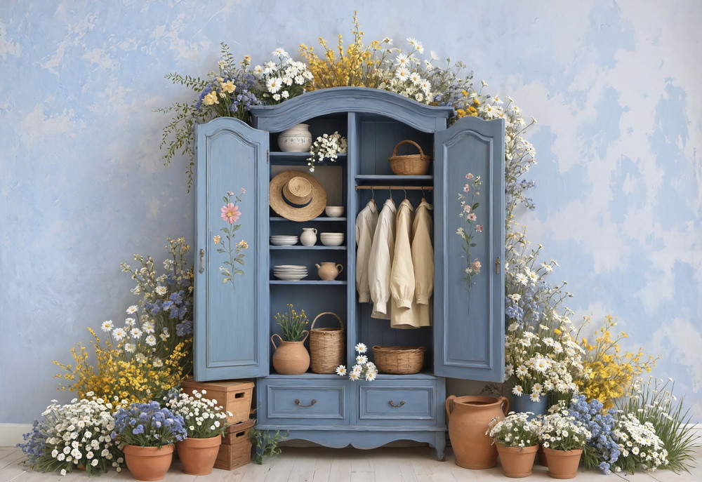 На изображении представлен интерьер с голубым шкафом, который стоит на фоне голубой стены с текстурой, имитирующей небо. Шкаф окружен множеством цветов разных видов и оттенков: белые ромашки, синие дельфиниумы и жёлтые полевые цветы.