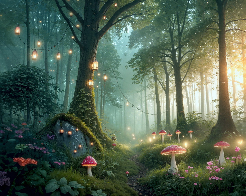 Изображение представляет собой сказочный лес, освещенный мягким светом. Земля покрыта мхом и травой, сквозь которые пробиваются цветы. В лесу растут мухоморы с красными шляпками, украшенные белыми пятнами.