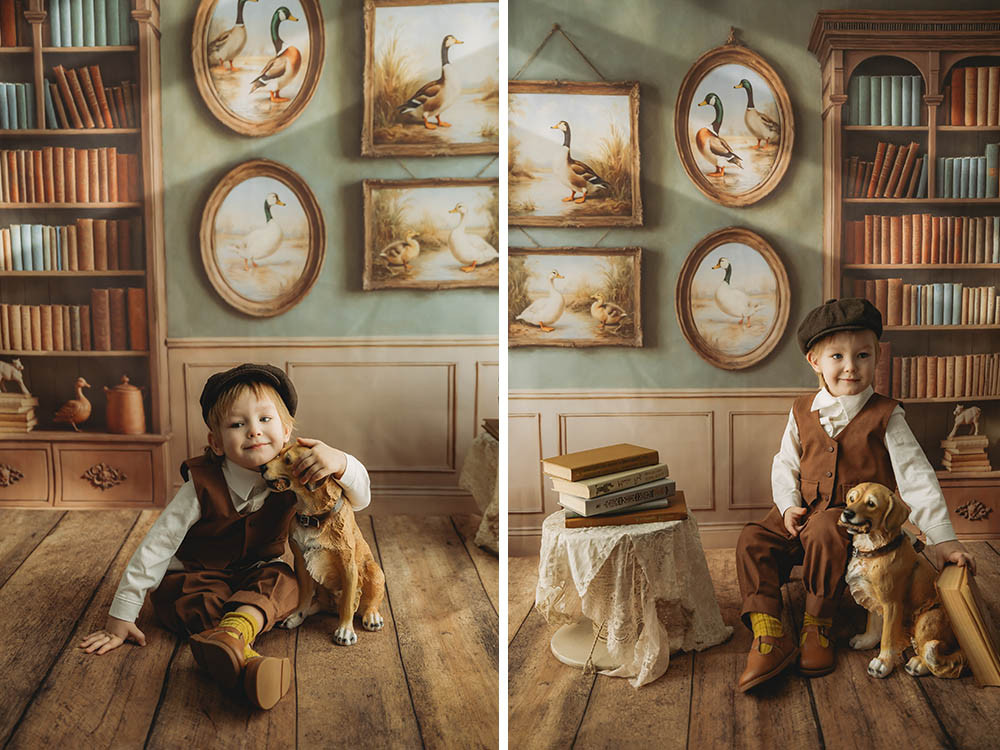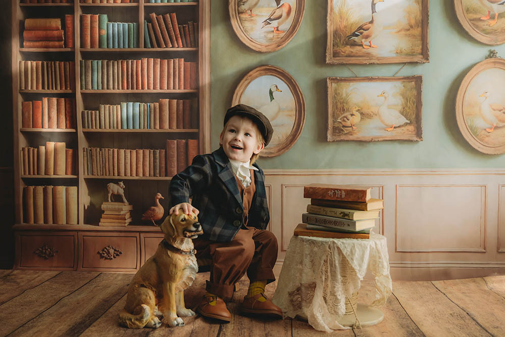 Изображение представляет собой интерьер комнаты, выполненной в классическом стиле. Слева расположен большой деревянный книжный шкаф, заполненный книгами разных цветов. Снизу у шкафа расположены выдвижные ящики с декоративными элементами.