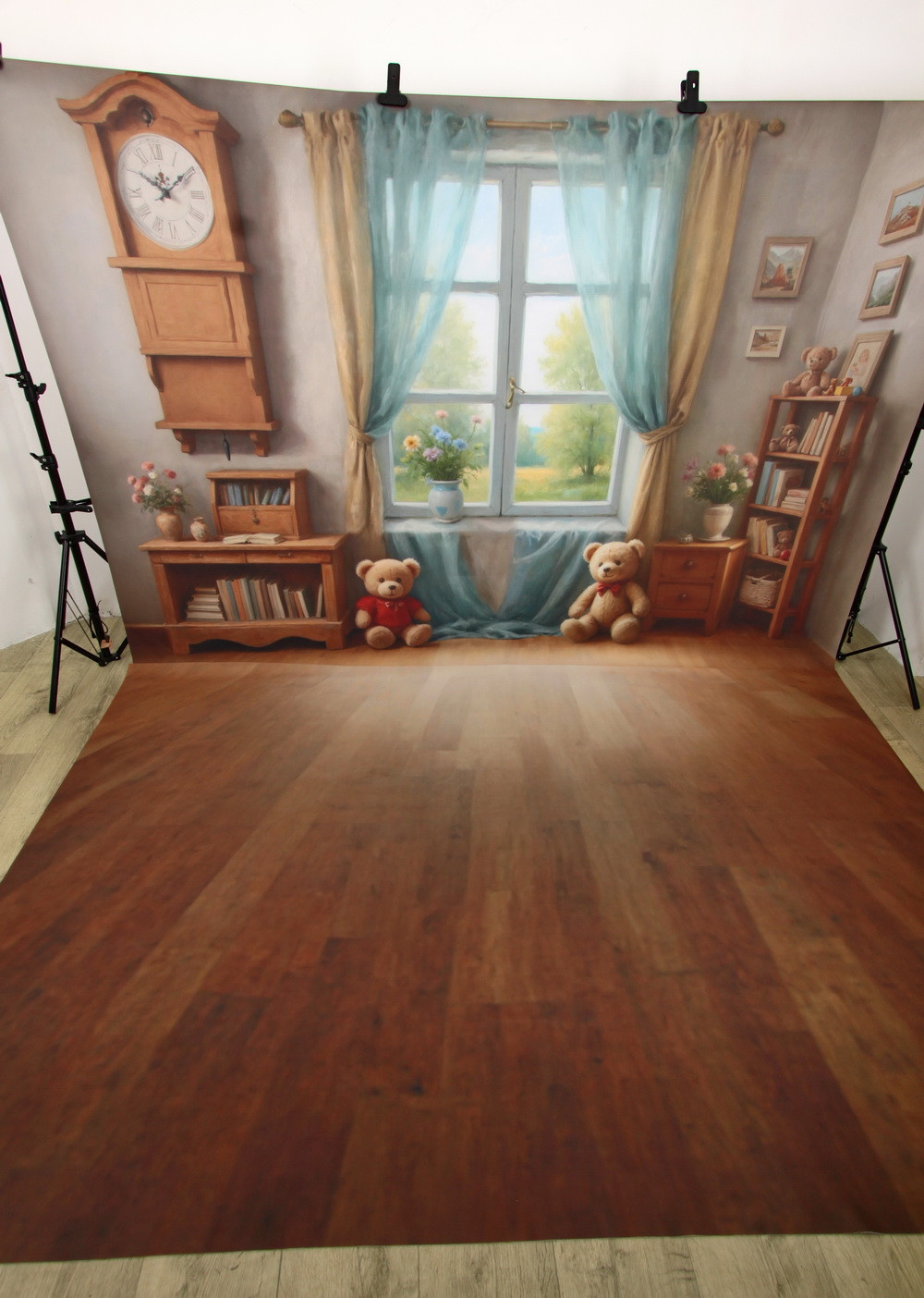 По центру кадра находится окно, обрамленное голубыми и бежевыми шторами. На подоконнике стоит ваза с цветами и драпировка из голубой ткани. За окном виден пейзаж с деревьями и полем. Перед окном сидят два плюшевых медведя. Один медведь в красной рубашке, другой с красным галстуком-бабочкой.